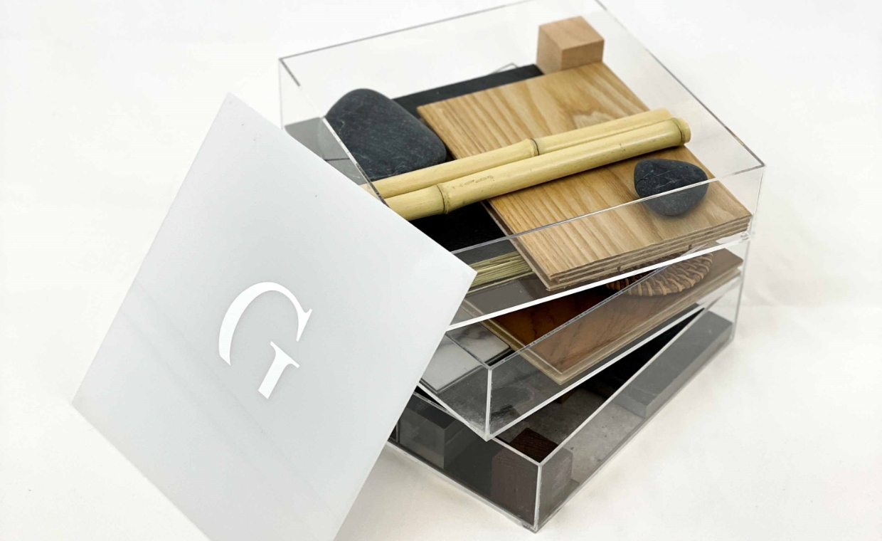 GLAMPの3つのスタイルをアクリルボックスに詰め込みました。LUX/VILLA/IORIの世界観を伝えます。